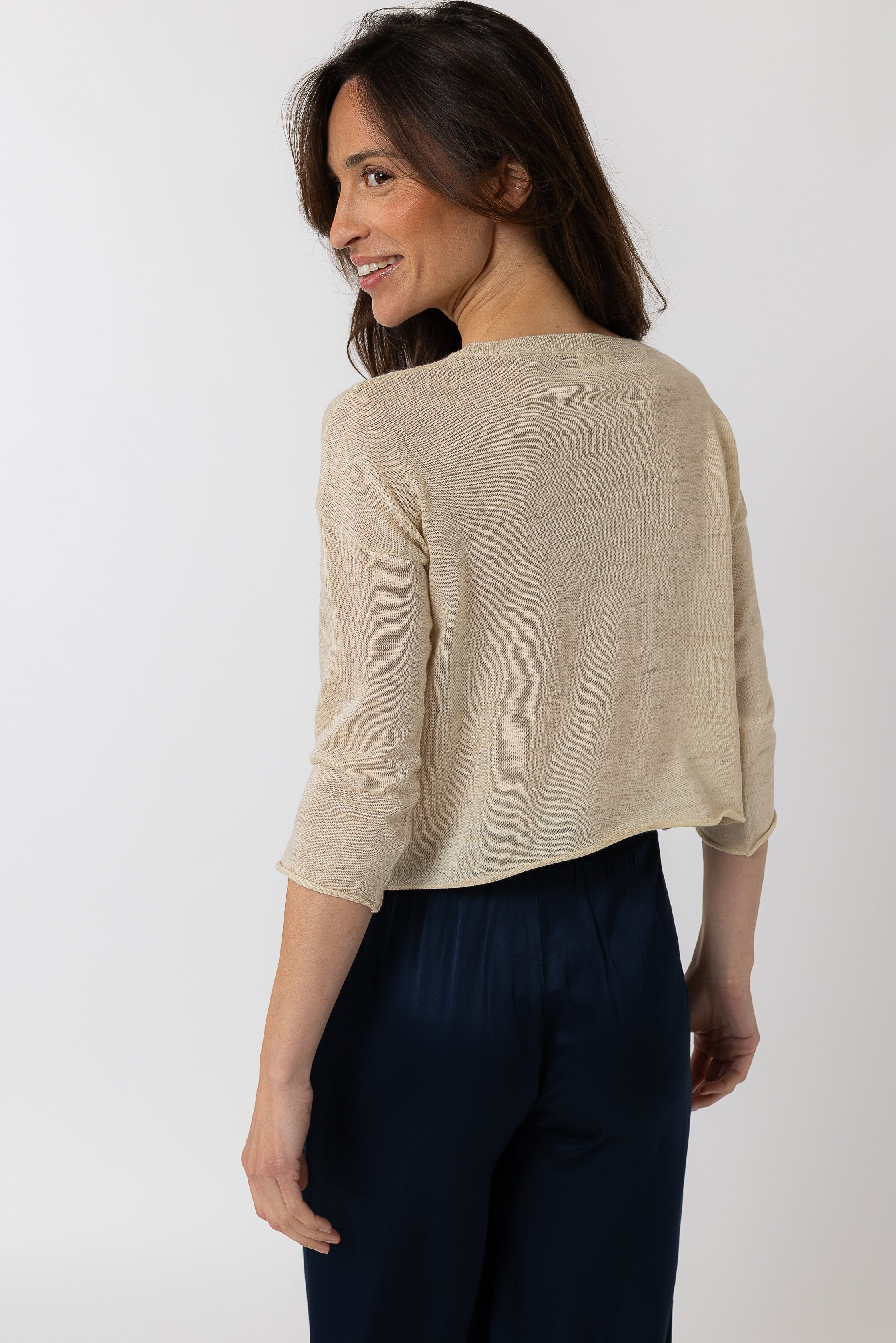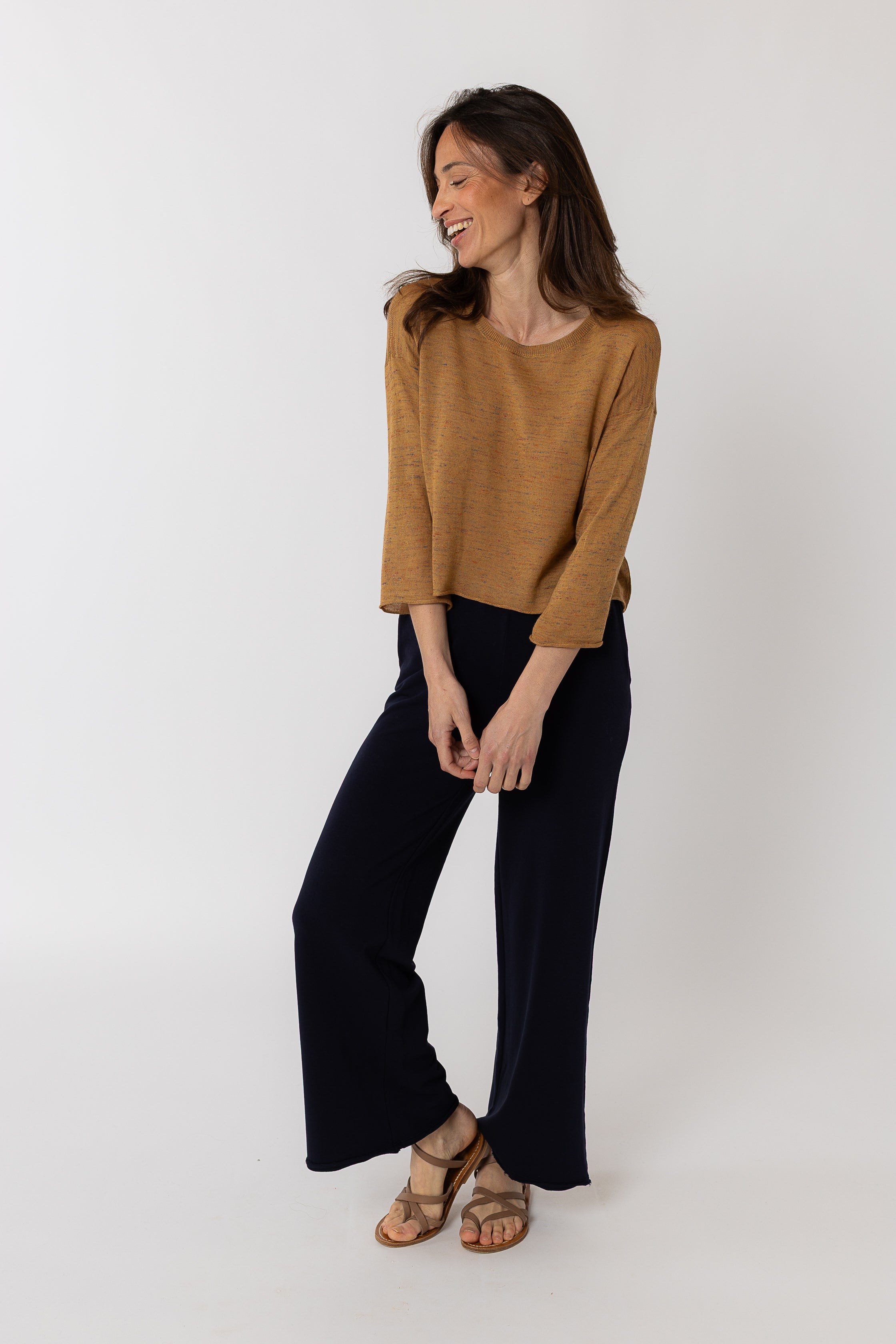 Un top court aux manches 3/4 : TOSCA. Il revient cette saison dans une maille chinée et légère !